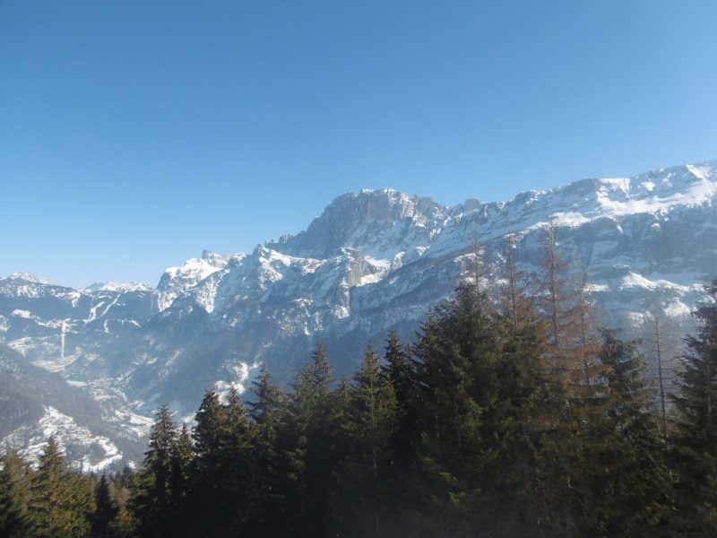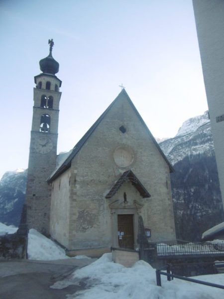 Torniamo alle baite di Zervenesch, qui l’intenzione era di fare un anello prendendo a destra, arrivare a Forcella San Tomaso e poi scendere a Celat, invece proseguiamo distrattamente a sinistra per la stradina di andata fino al bivio di Le Buse. Qui però non ricalchiamo le nostre orme del mattino andando a destra verso Costa Dagher, ma continuiamo a scendere per la stradina innevata che gradatamente cala nel bosco, si raccorda con il sentiero tematico delle Dolomiti in Miniatura, ci riporta al capitello in località il Cristo e poi al punto di partenza. Fine dell’escursione, facciamo un ultimo giro per il paese, Vaticano, Pro Loco, Planetario…il motto dipinto sotto una meridiana ci ricorda che ”L’è pì temp che vita, pì dì che luganeghe” (c’è più il tempo che vita e più giorni che salami) e sì, concordiamo, un po’ mestamente. Prima di risalire in auto visito la bella chiesa e il campo santo che la circonda, qui non è passato Napoleone e i morti riposano accanto alle abitazioni dei vivi, sul poggio più bello, rivolto al sole del mattino e alle cime della Civetta.
