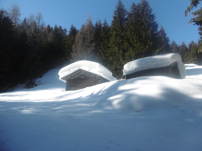 Passate le ultime abitazioni mettiamo i ramponi, oltrepassiamo i prati dando un ultimo sguardo al paese con i tetti ricoperti di neve (sembra un paesaggio natalizio) e ci addentriamo nel bosco. La stradina sale e seguendo per qualche tornante il percorso tematico “Dolomiti in Miniatura” ci imbattiamo nelle riproduzioni delle Tre Cime, Civetta e Pelmo, quasi invisibili perché la neve le ha trasformate in bianchi panettoni, ma da qui vediamo il Civetta in originale! Arriviamo ad un capitello, località il Cristo m. 1247 e continuiamo a salire nel bosco per la mulattiera innevata fino a raggiungere un bivio, dove prendiamo a sinistra, indicazione “S. Antonio-Le Buse”, a destra la stradina continua per Forcella San Tomaso (altra meta futura, si prosegue verso Canale d’Agordo). Il sentiero si fa più erto, saliamo scavalcando qualche schianto, la neve ricopre ogni cosa e non riusciamo a individuare il sentiero per Le Buse, troviamo diversi bivi senza indicazioni, non sappiamo che fare, la cartina è inutile, questi percorsi non sono segnati. Vado a naso e a una radura mi dirigo verso destra, ho scorto in lontananza un bipede che sale nel bosco: colpo di fortuna, il ragazzo è proprio sul sentiero giusto, al bivio con i cartelli (tutte le indicazioni sono a cura della Pro Loco) che indicano “Costa Dagher” nella nostra direzione e “Zervenesch”, la tappa successiva, diritto: siamo arrivati, per puro culo, in località le Buse, m. 1350. Posso chiamare la mia compagnia e continuiamo a salire fino a giungere ai prati innevati dove sorgono le baite di Zervenesch, m. 1503. Il luogo è pittoresco, in bella posizione assolata e panoramica, ci fermiamo per fare alcune foto, i tetti delle casere sono sormontati da un buon metro e mezzo di neve compatta, chissà quanta ne deve essere caduta a suo tempo!