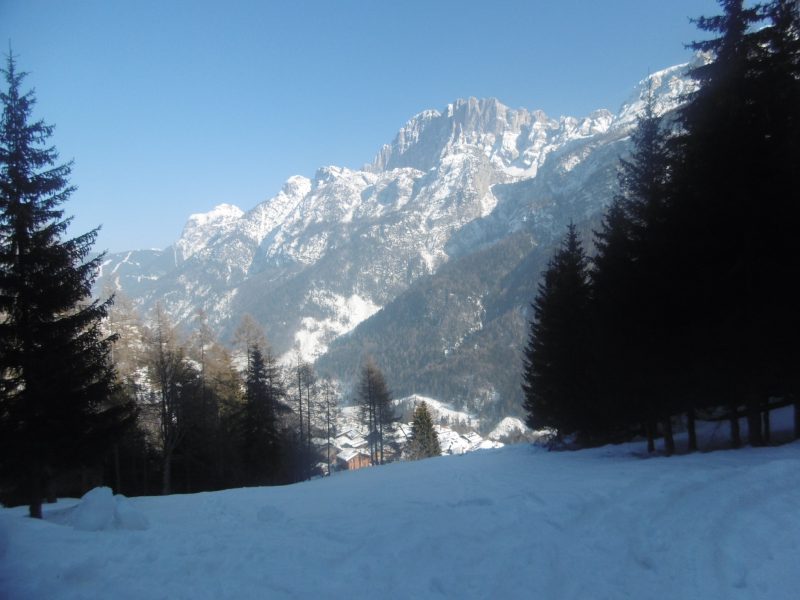 Parcheggiamo nella piazza del paese, accanto alla bellissima chiesa del XII secolo, il sole è sorto da un pezzo, ma deve ancora toccare questo paesino e fa piuttosto freddo, ci fermiamo un attimo per ammirare il panorama, Pale di San Lucano, Civetta, Sasso Bianco, solo quest’ultimo completamente illuminato. Ci incamminiamo in mezzo alle case, salendo per la via a sinistra della Pro Loco, trovando subito le indicazioni per Forcella San Tomaso. Passato un portico sotto un’enorme casa detta “Il Vaticano” per la sua ampiezza, già calpestiamo neve alta e ghiaccio, qui non si scherza: in una minuscola piazzetta vediamo due auto completamente sepolte da una coltre di neve ghiacciata, chissà se le utilizzeranno ancora a primavera! A sinistra una piccola fontana circolare, con al centro una colonna sormontata da un leone, butta abbondante acqua, questo paesino è proprio bello, case caratteristiche, belle decorazioni e murales, ci devo tornare senz’altro.