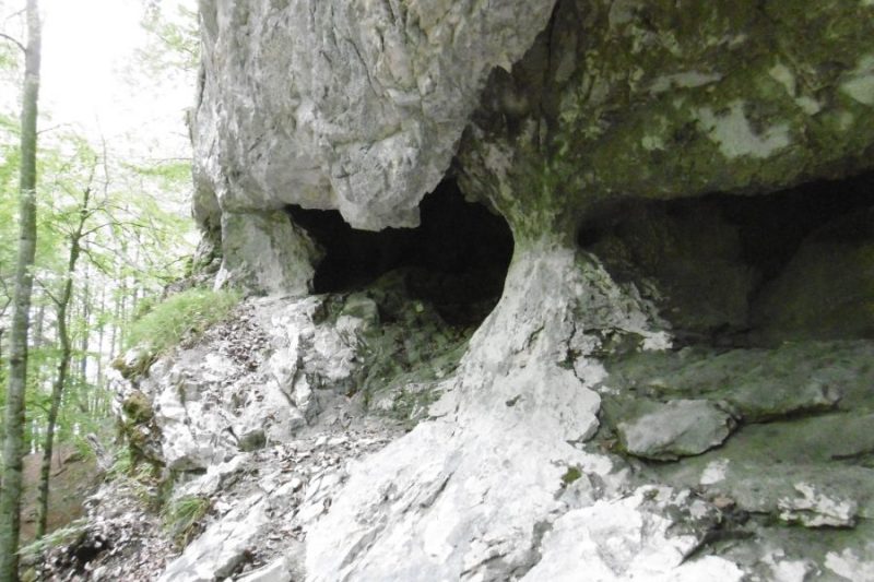 Siamo sempre immersi nel bosco, alcuni faggi monumentali spiccano tra le altre piante, il sentiero è stato liberato dagli alberi caduti a causa della tempesta Vaia, ma in alcuni punti dobbiamo superare enormi tronchi messi di traverso. Il bosco sembra non finire mai, ad un certo punto sulla destra alcune cavità nella roccia attirano la mia attenzione e salgo per esplorare, trovo una serie di piccole e anguste “caverne” che comunicano tra loro, frutto dell’erosione dell’acqua e del vento.