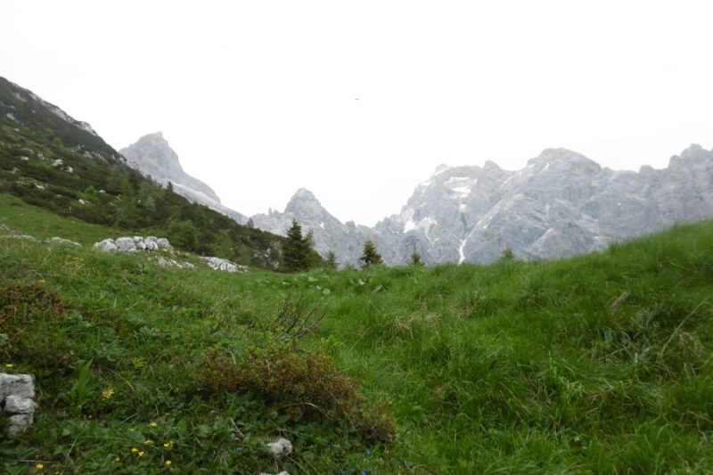 Ritorno dai miei compagni e riprendiamo la salita, a quota 1450 finalmente sbuchiamo nella zona dei pascoli dove alcune risorgive formano minuscoli stagni, continuiamo a salire per i prati fioriti, tralasciamo a destra il sentiero “Cimolais- Sentiero Valentino L.- per esperti” e arriviamo a una sorgente con abbeveratoio da cui scorgiamo il tetto della Casera. Un ultimo sforzo ed eccoci a Casera Lodina, m. 1565 s.l.m, dove incontriamo altri escursionisti e ci concediamo una pausa. Il luogo è magnifico, l’ex malga sorge alle pendici orientali del Monte Lodina ed è attorniata da bei pascoli, il panorama sul Duranno, sulle Cime dei Preti e dei Frati (nessuna suora riscontrata), Dolomiti d’Oltre Piave e tanta altra roba è spettacolare. Parlo con una giovane signora che sale qui ogni anno, l’escursione è considerata facile, consigliata anche per le ciaspe: in effetti è senza difficoltà, ma noi l’abbiamo trovata impegnativa: gli 800 metri di dislivello più lunghi che ci sembra di aver mai fatto! Sarà per il caldo afoso di questa giornata non certo per l’età che avanza. Meglio affrontarla in primavera o autunno, in futuro. I miei compagni si fermano qui, io so che i miei menischi me la faranno pagare domani, ma non posso fare a meno di salire alla Forcella, trecento metri più in alto e affacciarmi sul versante che scende verso il Passo Sant’Osvaldo, da dove ero salita anni fa con Salvatore, senza però scollinare verso Casera Lodina. Non so dove trovo l’energia, ma salgo rapidamente, la casera si fa sempre più piccola e lontana, poi scompare alla vista, supero i ruderi di Casera del Bergon m. 1779 s.l.m e in 20 minuti raggiungo l’ampio valico, m. 1860, tra il Monte Lodina e la dorsale di Cima Centenere.