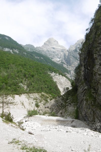 Lasciamo le auto nel parcheggio, attraversiamo la strada e ci incamminiamo per la sterrata C.A.I 374 risalendo il corso del torrente Compòl che scorre in mezzo ad un ampio letto sassoso, con i segni degli sconvolgimenti causati dalle sue piene. “Paesaggio dantesco” è un vocabolo abusato, ma viene spontaneo pensare al Sommo Poeta di fronte alla selvaggia bellezza delle nostre montagne. Ai lati scrutiamo le alte pareti rocciose per individuare i fiori da fotografare al ritorno, con più calma, per ora immortaliamo l’immagine dell’’imponente Monte Duranno, dritto davanti a noi e colpito dal sole del mattino.