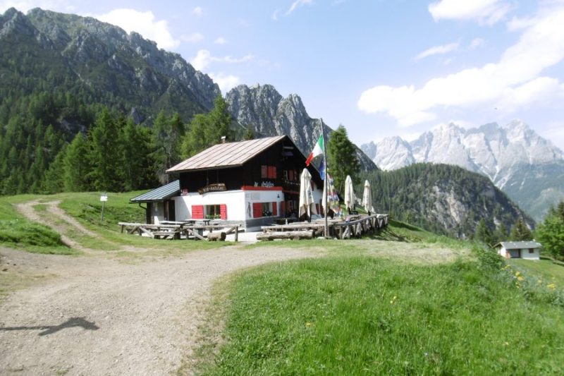Questa volta rinunciamo a salire fino alla cima, il Col de la Cross, è poco sopra, ma abbiamo ancora parecchia strada da fare. Dopo aver suonato la campana della Chiesetta scendiamo per il ripido sentiero che cala sul versante settentrionale del colle con vista su Antelao e Marmarole, fino alla sella di Pradonego dove sorge il Rifugio Antelao, m. 1796 s.l.m e facciamo una breve pausa.