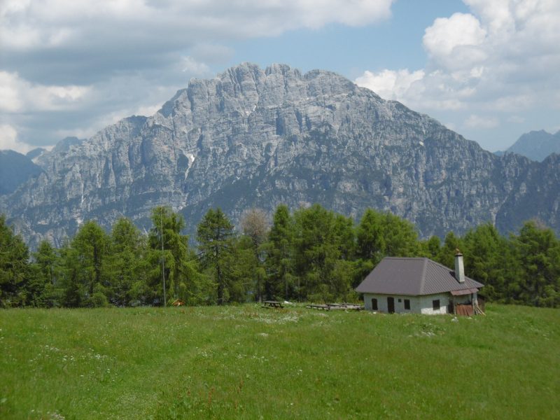 Scendiamo leggermente attraverso i prati, passando accanto ai ruderi di una grande costruzione che dalle spesse, enormi pareti di pietra squadrata a mano, somiglia più a un forte che a una stalla: “Associazione Comuni Italiani Segretariato della Montagna Direzione lavori Dott. G. Roiatti 1-8-1923” è la dicitura scolpita nella pietra. Casera Cornetto, adesso Bivacco Flavio Zanette (CAI Sacile), è stata restaurata recentemente ed è di proprietà del Comune di Cimolais. Ha un grande stanzone ben attrezzato con cucina economica, tavoli e panche, una scaletta porta ad una stanzetta superiore, con otto posti in letti a castello. Ci aspettiamo di vedere qualche quadrupede nei paraggi, un avviso raccomanda di “chiudere porte e finestre per evitare l’ingresso di capre”, ma non vediamo l’ombra di un ungulato.