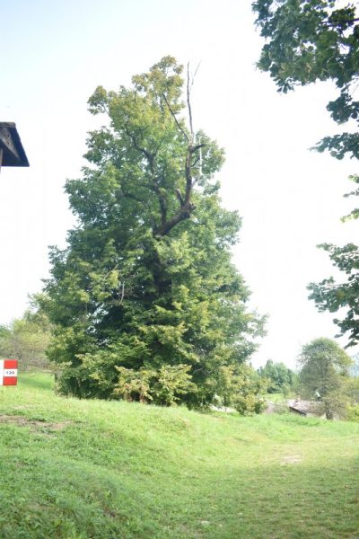 A piedi continuo su strada asfaltata per circa 500 m, ad un bivio non segnalato imbocco sulla sinistra il Sentiero degli Alberi Giganti (n. 120). Proseguo nel bosco in saliscendi ai piedi di Cima Campo Davanti. Il primo gigante vegetale che incontro è “El Linte delle Montagnole” un grande tiglio, albero sacro per le popolazioni germaniche (in tedesco Linde), salgo ancora e dopo poco arrivo a Malga Sebe e al “Fagaro di Malga Sebe di Sopra” (fagaro = faggio), un altro albero secolare. Continuo e arrivo nei pressi della vecchia cava di marmo, salgo ancora nel bosco e raggiungo Malga Anghebe, a lato di una conca verde con due pozze per l’abbeverata. Poco oltre la “Giassara”, un’ingegnosa costruzione tradizionale, la ghiacciaia dove si conservavano le derrate alimentari.