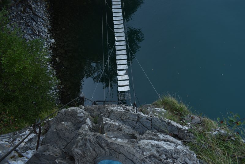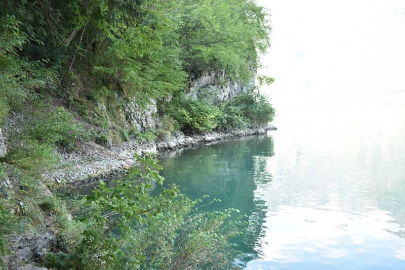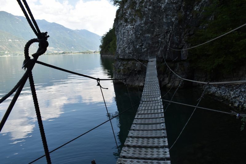 Indosso l’imbrago e inizio il Sentiero Ferrato delle Sasse, scendo nel bosco fino a lambire la riva del lago, discendo con l’aiuto delle staffe un salto verticale che mi riporta sul sentiero che cala ancora verso il lago. Arrivo al tratto più bello, la lunga cengia orizzontale che corre quasi a pelo d’acqua, il percorso è sempre aiutato dal corrimano e permette di guardare con tranquillità il bel panorama. Non trovo difficoltà, supero un facile gradone e un breve tratto franoso sempre in sicurezza, continuo in cengia panoramica e raggiungo una passerella sospesa e la prima uscita di emergenza, dove è possibile essere recuperati dal soccorso via lago.