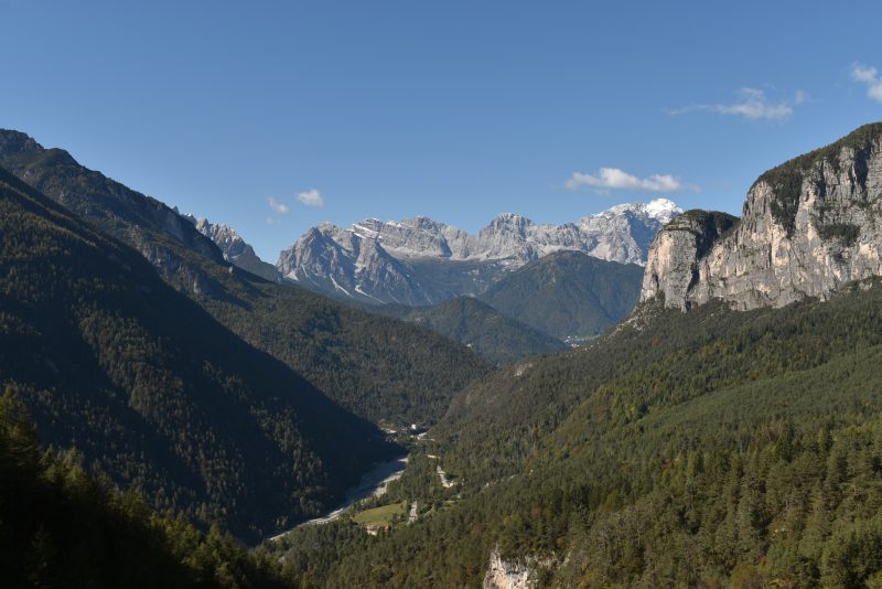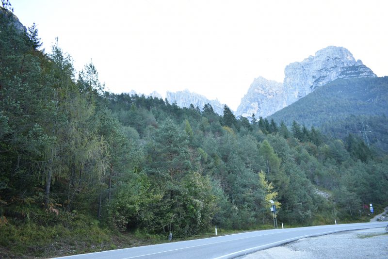 Leggo il messaggio su Facebook di Giuliano Dal Mas. Ha in programma un itinerario al Bosconero. Da Storo mi porto a Belluno e poi in val di Zoldo, a Pontesei. Subito dopo le due gallerie, passo la Diga di Pontesei che sbarra il torrente Maè. Trovo sulla destra della strada un ampio parcheggio pianeggiante. Qui passo la notte. Il tramonto mi regala le montagne infuocate del Bosconero e il mattino il sorgere del sole sul Civetta.