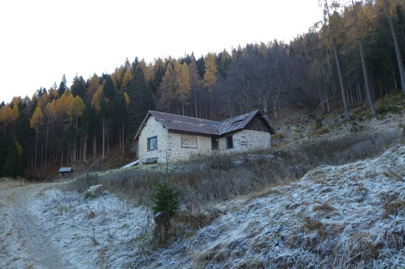 E’ ancora presto per fermarci e così proseguiamo per la stradina, seguendo il segnavia “Alta Via 1 variante zoldana”: pensiamo ci porti ad incrociare, qualche centinaio di metri più in alto, il sentiero CAI 536 che dal Passo Duran porta alla Baita Angelini. Saliamo per un pezzo in direzione delle propaggini del San Sebastiano, arriviamo fino dove la forestale si interrompe di botto, una traccia senza alcuna indicazione o segno sugli alberi prosegue nel bosco, ma a questo punto decidiamo di tornare indietro. Tornati alla casera ci accomodiamo nella stanza di mezzo, Roberto accende con perizia il fuoco e facciamo la nostra pausa “pranzo al sacco” attorno al focolare, che in verità non dispensa molto caldo, però a noi basta essere allegramente in compagnia.