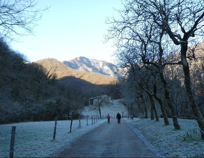 Al bivio lasciamo a sinistra la strada che prosegue per il Monte Tomba e le Malghe Comunali e prendiamo a destra, il percorso è vario, la strada asfaltata si alterna a sterrate e a tratti di sentiero. Siamo sempre accompagnati dal gelo passando per prati, torrenti, boschi, casere, ma anche gratificati da bei panorami. In località Marche troviamo un agglomerato di case e una fontana senza nome, forse perché è molto recente. Proseguiamo e ripassiamo il torrente su un ponticello che ci porta alla “Fontana della Busa de Jacomin”, in effetti siamo in un avvallamento. Risaliamo per sterrata, il sole illumina le montagne a mezza costa, sempre troppo in alto per toccare noi viandanti. Incrociamo la strada asfaltata in località Calonega, dove c’è una fontana con la stessa denominazione e un capitello dedicato a Suor Vincenza Gerosa e finalmente veniamo sfiorati dal sole.