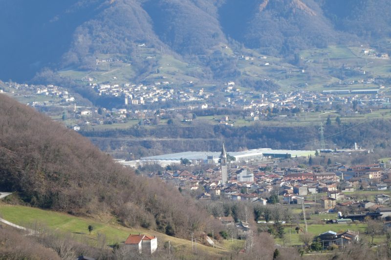 Case, alberi colmi di cachi, belle campagne … ma subito discendiamo nuovamente verso il torrente, all’ombra, dove il terreno è gelato. Passiamo vicino ad alcuni ruderi e a una delle prese dell’acquedotto, ne abbiamo viste diverse, questa è la “Sorgente La Calcola”. Al bivio nei pressi di una fontana innominata lasciamo a destra il “percorso breve” (8 km) e prendiamo a sinistra il “percorso Lungo” (circa 10 km) che ci porta ad altre case e alla fontana più rustica, la “Fontana de Pianar”, una semplice botte alquanto sconnessa. Giunti in località “La Pila” e alla fontana omonima, m. 600, troviamo la segnaletica per “Malga Camparona “e le “Porte del Salton”, ci annotiamo questi nomi per escursioni future e proseguiamo sul “Percorso delle Fontane” per la strada che svolta decisamente a destra, risalendo il versante opposto della valle (sinistra orografica del torrente Tegorzo). Ci alziamo guadagnando la visuale verso est, sul Monte Orsere, innevato e ben illuminato dal sole. Arriviamo a Pianar Alto, m. 661 (alcune case e due fontane col medesimo nome) il punto più alto, ma non ancora alla quota giusta per essere raggiunti dai raggi solari che invece inondano la valle, il paese di Alano accanto al torrente Tegorzo e quello di Quero, sulla riva sinistra del Piave.