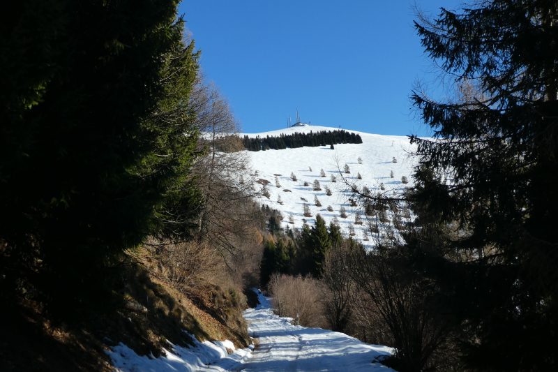 Lungo strada vediamo a destra alcuni sentieri dai nomi accattivanti, “Sentiero dei Narcisi”, “Sentiero del Giglio” che inerpicandosi sui colli accorciano il percorso, ma li riserviamo per la prossima primavera. Indossiamo i ramponcini e proseguiamo, la pendenza è leggera, ma ci alziamo di quota e possiamo vedere il corso del Piave, luccicante nella piana e poi il paese di Alano circondato dalla corona di monti innevati, scherzando fingiamo di individuare l’Anello delle Fontane, fatto di recente. Superiamo la stradina per l’Agriturismo Balcon che resta a sinistra e al bivio successivo restiamo sempre sulla strada voltando decisamente a destra. A sinistra si stacca la stradina per Malga Molvine e il sentiero 1012 che sale nel bosco verso i monti Orsere e Barbaria. Continuiamo calpestando neve e ghiaccio sulla comoda strada e finalmente vediamo spuntare le antenne poste sul Monte Barbaria, poco sotto si trova l’omonima malga, ora chiusa.