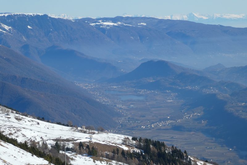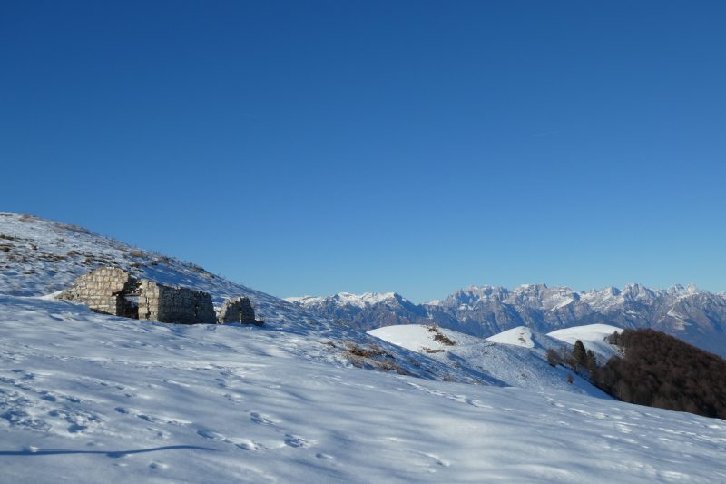 Un po’ lontano, verso sud, vediamo una croce, per il ritorno scenderemo da lì, seguendo il sentiero n. 1008. Il panorama, tralasciando le antenne alle nostre spalle (opere necessarie ma deturpanti) è da mozzafiato, ci affacciamo a sud, verso la pianura veneta che si perde all’orizzonte nelle nebbie, più vicina e nitida la piana da Follina ai Laghi di Revine, posta tra le Prealpi e i rilievi morenici, a est in lontananza si distinguono appena le vette delle Dolomiti Orientali…una bellezza indescrivibile. Continuiamo a scattare foto su foto… poi lasciamo la malga, potremmo raggiungere la cima con le antenne e proseguire per la dorsale, ma preferiamo continuare per la strada che ci porta a una piccola insellatura ventosa da dove lo sguardo può posarsi sul versante settentrionale e avere la prima vista verso le Vette Feltrine. Oltre un altro avvallamento con una “posa” ghiacciata scorgiamo a sinistra il profilo del Cesen, una sequenza di dossi innevati, poco dopo arriviamo a Malga Mariech, m. 1504, una bella costruzione con alle spalle una lunghissima stalla.