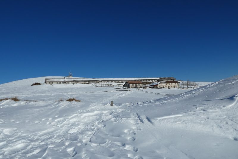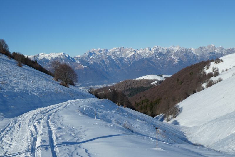 Il grande parcheggio è già quasi al completo, ci sono molte famiglie con bambini e slittini, passeranno qui una bella giornata sulla neve. Nel piazzale c’è anche il Tempio Internazionale del Donatore, costruito nel 1962 da un gruppo di donatori del sangue nel luogo dove sorgeva una postazione di cannoni della Prima Guerra. La segnaletica è abbondante, sono indicati almeno una decina di malghe, rifugi e altrettanti sentieri, noi prenderemo la strada asfaltata, ma ora ricoperta di neve, che sale a nord-ovest. Il lungo percorso taglia con due diagonali i versanti occidentali dei monti Orsere e Barbaria, passiamo accanto alla costruzione dell’ex skilift e poco dopo ad alcuni enormi, magnifici faggi nei pressi di una piccola casera. Ci inoltriamo tra boschi e pascoli innevati contemplando il panorama che si apre alla nostra sinistra, verso la pianura insistono le nebbie, fino a sfiorare le pendici del Grappa.