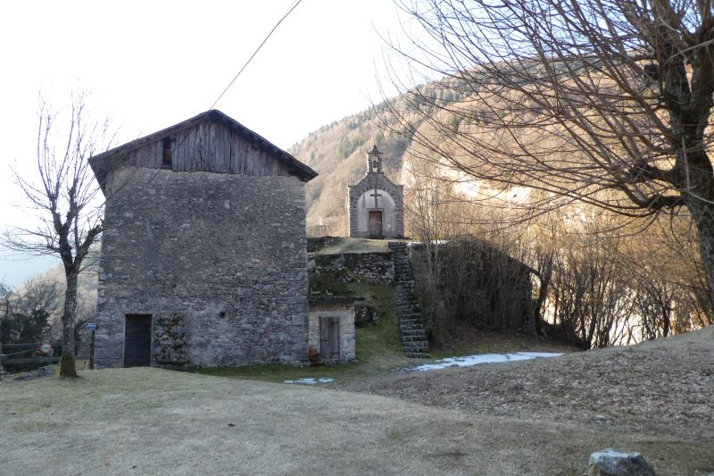 L’acqua del Senaiga e dei suoi affluenti alimentava numerosi mulini, gran parte dei quali furono costretti a chiudere nel 1886 con l’aumento della tassa sul macinato. Dopo l’ammissione alla Repubblica di Venezia nel 1886 le condizioni economiche delle popolazioni di queste terre peggiorarono per l’imposizione di tasse insostenibili e per l’obbligo, per gli uomini, della leva militare. Cominciò quindi l’emigrazione verso le Americhe e l’Australia, che spopolò il territorio. Scendiamo per il prato, fiorito di bucaneve, raggiungendo stavolta la stradina-sentiero ufficiale che seguiamo sempre in discesa fino alle abitazioni di Pian. Il borgo, un tempo abitato da molte famiglie, sorge in un fazzoletto di terra a strapiombo sulla valle dove scorre il torrente Senaiga. Il posto è molto bello, panoramico e di grande tranquillità, la struttura delle case è stata conservata integralmente, l’abitazione vicino alla fontana è priva di camino, il fumo del focolare usciva dalla parte superiore della porta, che era divisa in due, per mangiare la famiglia doveva uscire sulle scale esterne! Chissà quante storie avrebbero da raccontare queste pietre. Ci incuriosisce un’abitazione particolare, le pareti sono zeppe di scritte, oggetti strani, arnesi di lavoro, legni intagliati, civette… Una delle mie amiche che è già stata qui, dice che ci vive un unico abitante, un personaggio eccentrico, una specie di artista –eremita – giardiniere, sicuramente amante della solitudine. Oggi è assente, quando mi avvicino un poco alla casa per fare una foto scatta una sirena (sistema di allarme artigianale) probabilmente l’uomo è stato infastidito da persone irrispettose, lo si capisce dal tenore di alcuni cartelli. Che tristezza, una persona che vuol solo vivere a modo suo deve difendersi da gente ignorante che si diverte nel farne oggetto di derisione e vandalismi. Davanti alle case, su un piccolissimo poggio sorge una chiesetta, dietro al piccolo edificio sacro…le pareti rocciose strapiombano nella gola. L’inaugurazione della chiesetta, avvenuta nel 1935, fu funestata da due eventi luttuosi: una bambina proveniente dal paese di Roa annegò nell’attraversare il torrente Senaiga, nel pomeriggio al rientro alla Roa una ragazza perì allo stesso modo.