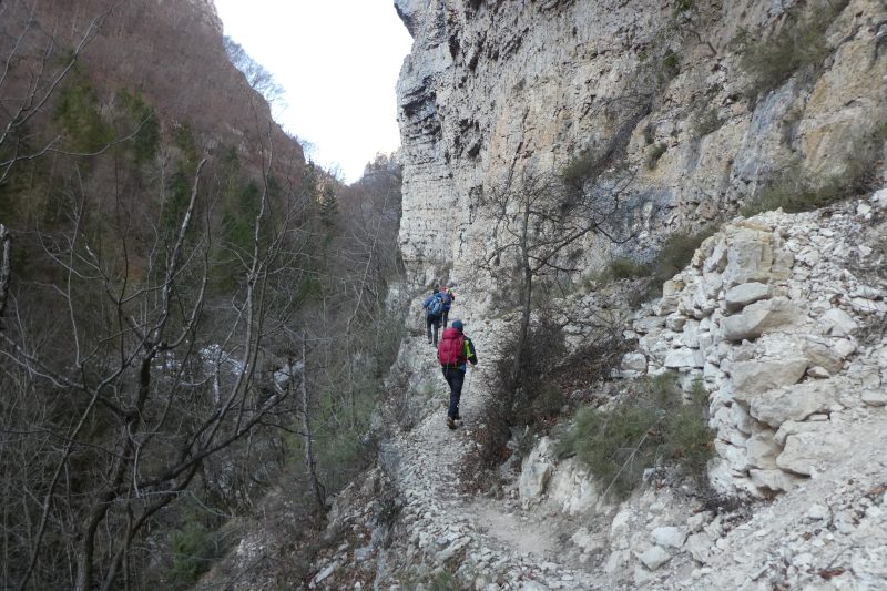 Parcheggiamo poco prima del centro del paese, nel cortile davanti alle ex Scuole. Scendiamo al crocevia dove ci sono alcuni cartelloni che illustrano le molte bellezze del luogo, tra cui la Cascata del Salton, la nostra prima meta mattutina. Ci avviamo in discesa per la strada asfaltata che porta alla vicina località Crosere, dopo poco prendiamo una scorciatoia sulla destra che ci permette di avere una prima visione della forra dove scenderemo, profondamente incuneata nella Val Senaiga. Da una parte e dall’altra dei versanti (destra orografica trentina, sinistra lamonese) vediamo piccoli borghi abbarbicati sui piani sovrastanti le rocce a strapiombo. Raggiungiamo Crosere, un bel gruppo di case abitate solo nella buona stagione, accanto alla fontana troviamo dei cartelli molto invitanti che indicano nella stessa direzione: “Grotta dell’Acqua Nera”, “Grotta Bus de la Bela”, “Necropoli Romana” e “Cascata al Salton”. Il percorso “ufficiale” scende per comoda stradina sterrata, ma noi siamo in vena di esplorazioni e imbocchiamo il sentiero a lato, dove poco dopo troviamo un tipico “altariol” con crocefisso. Proseguiamo per qualche decina di metri passando vicino ad alcune case abbandonate e poi lasciamo anche il sentiero (che riporterebbe sulla stradina) per scendere a destra su traccia non segnata che cala ripida nella forra boscosa. La traccia finisce su una stradina sterrata in prossimità di un crocefisso di legno (protetto come l’altro da un tettuccio conico di metallo) che ci porta alle case di Molin de Sora, una grande macina incastrata in un muretto di sostegno testimonia l’antica funzione delle costruzioni, su un portone d’ingresso si legge la data 1758. Non sappiamo come facessero gli abitanti di allora a portare l’acqua a questo mulino posto su un ripido pendio che ci pare distante dalle sorgenti, ma qualche ingegnoso sistema l’avranno escogitato.