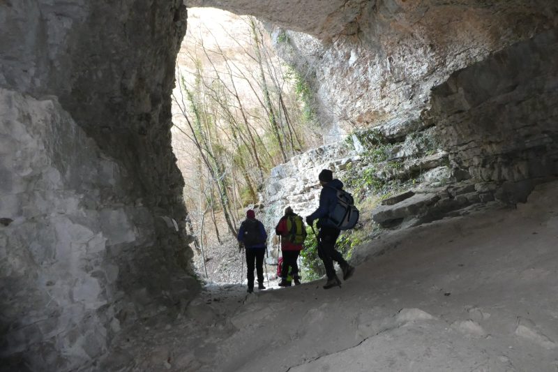 Entriamo solo per pochi metri, illuminando la grande caverna con le pile, non ci pare il caso di inoltrarci nei cunicoli, visto che per le difficoltà e le tecniche specifiche richieste dalle caratteristiche della grotta, l’esplorazione è iniziata solo negli anni 70 da parte di un Gruppo Speleo sub di Padova e continuata negli ultimi anni da un Gruppo Speleologico di Valstagna (VI), sono stati esplorati 1600 metri superando tre impegnativi sifoni e molti difficili passaggi. Presso un’altra grotta, il Bus de la Bela (detto anche Bus de la Vecia, della Tosa o Grotta di San Donato) sono stati trovati i resti di diversi esemplari dell’Ursus Spelaeus, l’orso delle caverne (di grosse dimensioni) che nel periodo tra il Pleistocene medio e il tardo Pleistocene abitava questo territorio, contemporaneamente al leone delle caverne e alla pericolosissima specie Homo (neanderthalensis e sapiens). Ho visitato questa grotta molti anni fa, ma oggi non è in programma, nel pomeriggio ci aspetta la Val Nuvola. Uno scheletro proveniente da questa grotta è esposto al museo Civico di Crocetta del Montello, altri a Lamon, non mi ricordo se nelle Scuole o in Municipio.