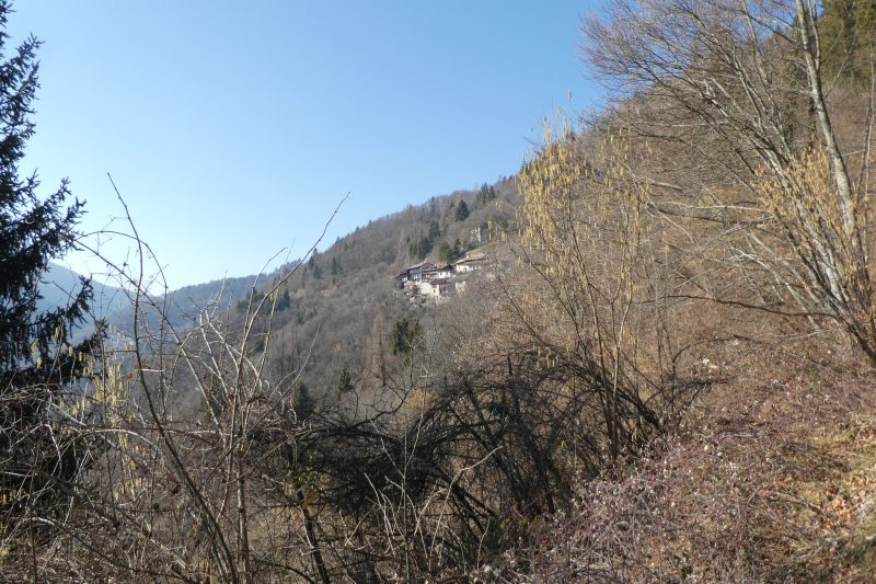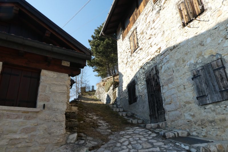 in mattinata abbiamo visitato la Cascata del Saltòn e la Grotta dell’Acqua Nera (n. 675 e 676 in questo blog) scendendo da San Donato di Lamon nella profonda gola percorsa dal torrente Senàiga. Una volta riemersi dalla forra ci concediamo una solare pausa pranzo a Crosere, poco sotto il paese di San Donato, poi nel primo pomeriggio andiamo alla scoperta di Val Nuvola. Sono molto incuriosita da questo nome poetico, non so bene se sia una vallata, un paese o… un’utopia, cerco di non farmi illusioni per non rimanere delusa. Partiamo da San Donato, la stradina carrabile che va verso ovest (in direzione opposta al centro del paese, cartelli) parte dall’incrocio e seguendola si arriverebbe in Val Nuvola in 30/40 minuti. Noi però vogliamo arrivarci per sentiero per cui ci avviamo per la stradina appena sotto le Ex Scuole dove abbiamo parcheggiato, arriviamo a una piccola cappella e continuiamo in leggera salita per la sterrata in direzione dell’abitato di Galline, m. 950, che avvistiamo ad una svolta, un piccolo borgo disabitato aggrappato al pendio.