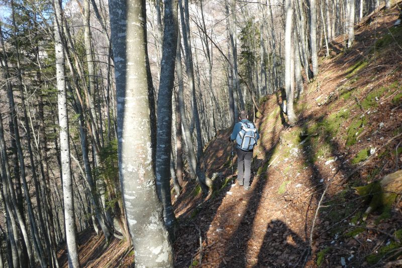 Non ci sono indicazioni, ma un po’ aiutati dal GPS, un po’ dall’intuito, prendiamo il sentiero a sinistra e andiamo avanti nel bosco che alterna bellissimi faggi agli scuri abeti, di volta in volta trascuriamo le tracce che si diramano verso l’alto o verso il basso, continuando più o meno in quota.  Il percorso è piacevole, immerso in bei boschi dove si intravedono ancora i muretti a secco degli antichi terrazzamenti, qui si coltivavano cereali, patate e persino il tabacco dal cui contrabbando dipendeva parte della sussistenza della gente del luogo. In alcuni tratti la traccia si restringe a causa degli smottamenti e bisogna fare attenzione. Ancora non sappiamo se siamo o meno sul percorso giusto, secondo la cartina dovremmo aver passato la Val Falcari e la Vall’Arsa, ma restiamo in dubbio fino a quando, sbucati in un pendio dove il bosco si dirada, vediamo in lontananza un cartello: “Val Nuvola – T. 14” che indica la nostra meta a sinistra, in discesa.