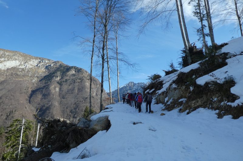 l’inizio è ripido, ma ci permette di abbreviare il percorso. Il sentiero è in ombra, il sole non ha ancora superato questo versante, ma è ben battuto, i ramponi fanno il loro dovere e saliamo senza problemi in mezzo ai boschi, incrociando a volte la strada. Siamo un gruppo numeroso ma molto ben organizzato, la nostra lunga fila si snoda ordinata, il percorso prosegue per i tornanti di una pista lungo la quale scendono alcuni sciatori (diamo loro la precedenza) dove finalmente troviamo il sole. Ad una svolta possiamo ammirare un superbo panorama verso Cima Borgà, il Duranno, Cima Preti, Col Nudo… e altre vette che non conosco, adagiati nella valle i paesi di Claut e Cellino.