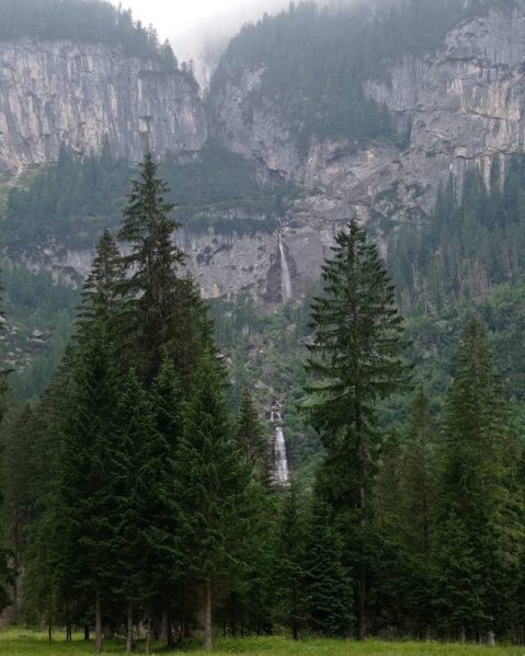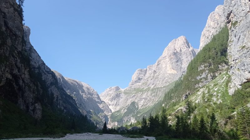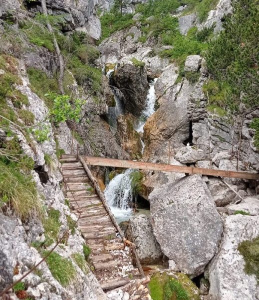 Arriviamo alla Cascata Inferiore e poi saliamo a quella Superiore, a quota 1519 metri, il potente getto precipita dall’alto e si nebulizza tra i grandi sassi, spesso formando un arcobaleno. Scattiamo qualche foto e poi proseguiamo a sinistra, sul sentiero che presto si alza per superare la balconata rocciosa e poi piega a destra in cengia esposta (ma attrezzata con cordino) tra i mughi, verso il punto da cui scende la cascata. Anche se ho fatto questo percorso altre volte, per me è sempre emozionante trovarmi sul bordo della forra, ma per la mia amica è addirittura fantastico! Entriamo nell’Orrido delle Comelle, attraversiamo l’acqua su un precario ponticello, un cordino ci rassicura nei punti esposti e grazie a scalette, pioli e funi metalliche ci issiamo sui massi e procediamo tra le rocce della stretta forra. Il paesaggio è tormentato e affascinante, alla fine dell’Orrido massi in bilico e pareti strapiombanti spariscono come per incanto, insieme al fragore dell’acqua che ora scorre nel sottosuolo sassoso: sbuchiamo dall’ombra alla luce nell’immenso Pian delle Comelle, una vasta piana di ghiaie compresa tra due versanti, a destra le Pale di San Martino con la Cima delle Comelle, a sinistra le Pale dei Balconi. Andiamo avanti per più di due chilometri, superiamo il masso che indica alla nostra sinistra (destra orografica) la traccia per il Viaz del Bus e proseguiamo diritte senza seguire un sentiero, puntando alle pareti rocciose davanti a noi che sembrano sbarrarci il passo. Camminiamo sulle ghiaie al centro del pianoro, ai lati la pietraia cede il passo a lembi di prato, a tenaci fioriture e a macchie di cespugli e di aghifoglie. Giungiamo alla fine della valle e fatichiamo un po’ per ritrovare i segni del sentiero, individuiamo i bolli rossi su alcun sassi alla nostra destra e risaliamo una pietraia per poi superare il Lastedèl, un balzo roccioso provvisto di cordino metallico. Saliamo per le placche, non piove da molto e non sono scivolose, con l’aiuto della fune arriviamo a un piano erboso e ad un bivio, i cartelli con i segnavia sono rovinati a terra, ma questo punto me lo ricordo, è il bivio col sentiero 716 che proviene dal Passo delle Farangole, ci sono passata con Salvatore facendo l’Alta Via n. 2, arrivavamo dal Rifugio Mulaz per dirigerci al Rosetta. Guardo in quella direzione, torrioni e guglie si innalzano sopra le balze rocciose ricoperte dai mughi, Farangole, Cima Vezzana, la Torcia di Valgrande…