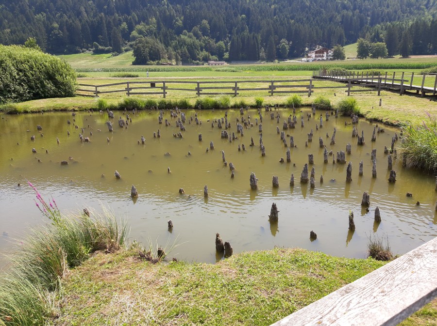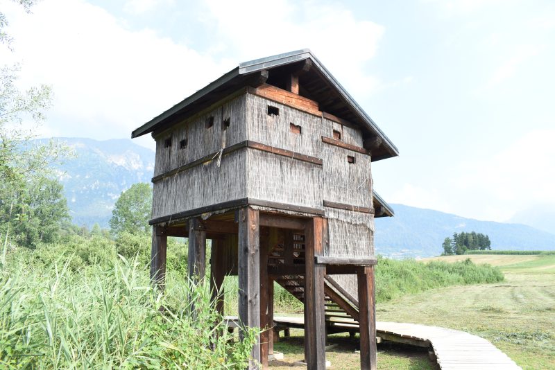 Il tempo si è fermato e sto facendo un salto nel passato. Sabato mattina mi sveglio presto, colazione veloce, preparo lo zaino con una bottiglia di acqua e della frutta, macchina fotografica al collo e scarponcini comodi ai piedi parto alla scoperta di questo silenzioso e panoramico luogo. L’altopiano morenico di Fiavè si è formato milioni di anni fa con il ritiro dei ghiacciai. Mi incammino sulle stradine di campagna compiendo un giro largo per raggiungere il parco di “Archeo Natura”. Oggi l’altopiano è un’oasi verde dove perdersi in rilassanti passeggiate, oltre a scoprire l’archeologica e i modi di vita dei nostri antenati. La prima parte di questo giro si svolge nel bosco al limite dei campi coltivati a grano. Giungo al bivio dove trovo l’indicazione per il parco Archeo Natura e la seguo, arrivando a un punto di osservazione molto suggestivo e panoramico. Continuando a comminare sulle passerelle gettate sul terreno di torba e giungo a un altro punto di osservazione.