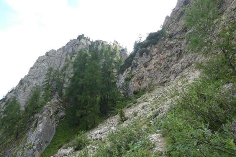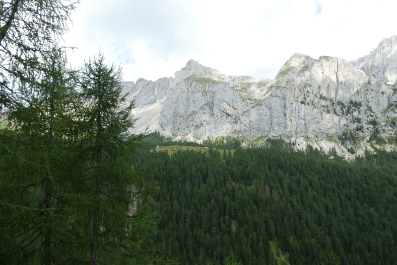Cerchiamo le indicazioni per il sentiero CAI 687 che dovrebbe partire da qui, ma non vediamo nessun cartello (poi sapremo il perché). Consultando la cartina decidiamo di fare l’anello in senso antiorario, proseguiamo oltre il campeggio seguendo la stradina CAI 610 che porta al Rifugio Falièr, superiamo Malga Pian Grant e oltrepassiamo il ponte alla confluenza con diversi torrenti, di acqua ce n’è poca, ma dallo sfacelo di rocce e massi si capisce che quando arriva una “brentana” i ruscelli diventano fiumi in piena. Abbandoniamo la stradina 610 che sale a tornanti a destra e prendiamo a sinistra il sentiero 684 per la Val  Franzedàs (a volte scritto “Franzedaz”), F.lla Chegarìs e Forca Rossa.