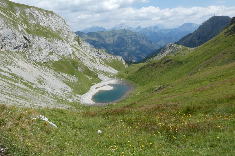 Il panorama è bellissimo, Marmolada, Monte Fop, Forcella Ombretta, i pascoli verso il Falièr, Forca Rossa, Col Bechèr, le Cime d’Auta Occidentali… Ci avviciniamo alle pareti rocciose del Mont Alt d’Auta, solcate da buchi e cavità in cui è facile immaginare facce e volti, incrociamo due escursionisti in discesa e eccoci ai piedi della forcella, un canalone erto e dirupato, dilemma: saliamo a destra aiutate da un cordino o ci teniamo sotto parete a sinistra, dove il percorso sembra meno disagevole? Ognuna sale come meglio può, ci voltiamo ogni tanto per ammirare Malga Franzedàs sempre più piccola e immersa nel verde, dominata dalla mole del Monte Fop, e finalmente arriviamo in cima. Il percorso si fa piano, anzi in leggera discesa in mezzo a un bel pianoro erboso con mughi e radi alberi di larice e abete, fiori coloratissimi tra cui il bellissimo e mortale aconito. Seguiamo il sentiero 684 per Forcella Franzei e Pianezze fino a un incrocio con vari sentieri segnalato da diversi cartelli, dove prendiamo a salire per il CAI 687 in direzione Lach dei Giai (Nègher), in pratica costeggiando i piedi del Mont Alt d’Auta. Poco dopo incontriamo e superiamo un gruppo di persone che provengono dal sentiero CAI 688 Franzei-Sottoguda (vecchia numerazione CAI 1688) e dirette alla nostra stessa meta. Passiamo una forcelletta senza nome, saliamo un costone prativo tra ampi valloni e continuiamo a salire, fino ad arrivare al laghetto naturale, m.2205, incastonato tra il Mont Aut d’Auta, la Crepa Rossa e la Cima Orientale d’Auta.