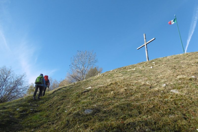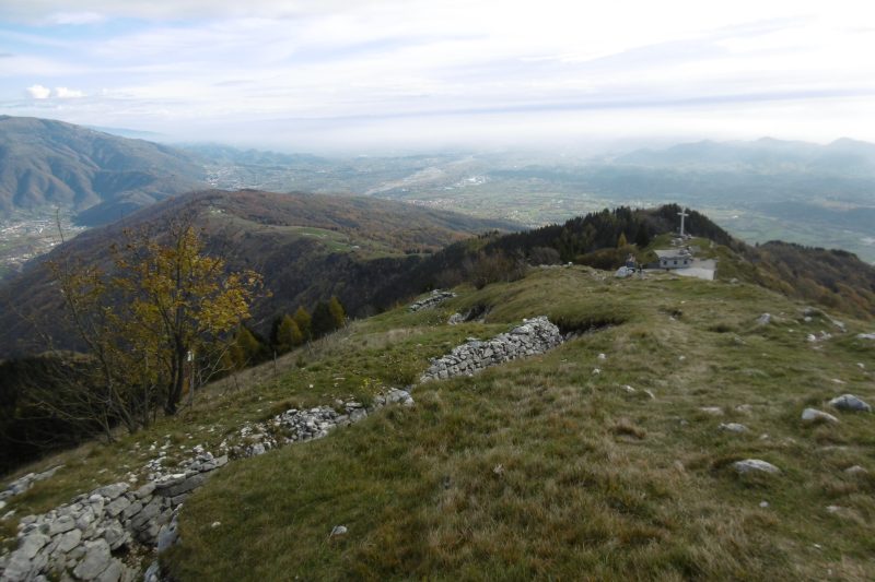 Ci soffermiamo un poco alla croce, a quota m. 1140 per ammirare il panorama e leggere la cartellonistica, poi proseguiamo sempre sul 212 in falsopiano verso il monte Palon, m. 1210, trovando lungo il percorso altri camminamenti, trincee, gallerie e fortificazioni della Grande Guerra. Proprio sotto la cima entriamo in una galleria, scendiamo per una scaletta metallica e percorriamo i corridoi e i tunnel sotterranei, che poi ci fanno sbucare all’aperto. Saliamo alla croce, da dove abbiamo un vastissimo panorama a 360 gradi, visitiamo altre trincee e postazioni (il restauro è stato curato dagli Alpini di Possagno) e leggiamo i cartelloni illustrativi che ci riportano indietro di più di 100 anni, quando, dopo la rotta di Caporetto, lungo la dorsale Monfenera-Tomba-Palon l’esercito italiano combatteva duramente per la difesa del fronte contro gli austriaci.