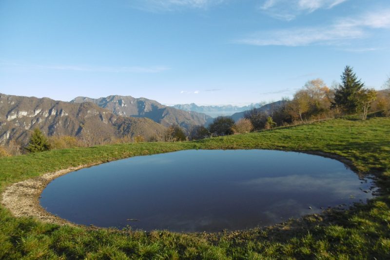 Dopo la sosta torniamo in discesa a Bocca de Forca, prendiamo la sterrata che sale a Malga Piz (ora chiusa) e da qui scendiamo per tracce a Malga Barbegera, m. 1198. Trascuriamo a destra la stradina che ci riporterebbe in piano al Monte Palon e prendiamo, vicino al capanno degli attrezzi, la mulattiera che scende in mezzo ai pascoli arrivando a una pozza d’acqua per l’abbeverata. Andando a sinistra si arriverebbe a Malga La Fossa e al Monte Tomba, noi individuiamo sulla destra un sentiero che si inoltra nel bosco e raggiungiamo in discesa una sterrata che secondo noi ci dovrebbe riportare al punto di partenza, direzione sud-est. Non sbagliamo, la forestale passa prima per un bel bosco di abeti e poi di faggi e arriviamo tranquillamente nei pressi della Trattoria da Miet, dove ci fermiamo per un giro di birre e tre fette di ottima torta, finendo in allegria questa bella giornata autunnale. Dopo la sosta ci rechiamo in auto al Monte Tomba, m. 868 (vasto parcheggio) e visitiamo il sito con i cippi, il monumento ai caduti e la chiesetta. Anche qui vale la pena di leggere i pannelli con la descrizione, purtroppo attuale, di uno scenario di guerra: