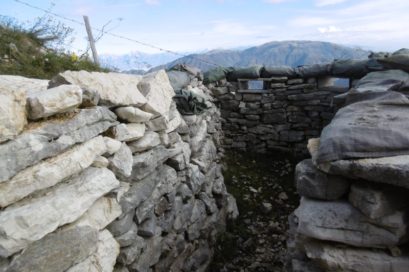 Prendiamo il sentiero 212, segnato da un paletto, che corre sulla dorsale prativa dietro all’edificio in direzione ovest, verso il Grappa. Da subito il panorama è notevole, a nord vediamo le Vette Feltrine, le cime Dolomitiche, la pianura di Alano e del Piave, a est il Cesen e a sud l’immensa pianura veneta e il Montello, peccato che oggi ci sia foschia, altrimenti vedremmo anche la laguna. Dopo il primo piacevole tratto su prato arriviamo ad un bivio e decidiamo di proseguire a sinistra, il sentiero entra nel bosco in salita a tratti ripida e ci porta alle prime trincee e gallerie nei pressi della Cima di Castel Cesil, che raggiungiamo poco dopo.