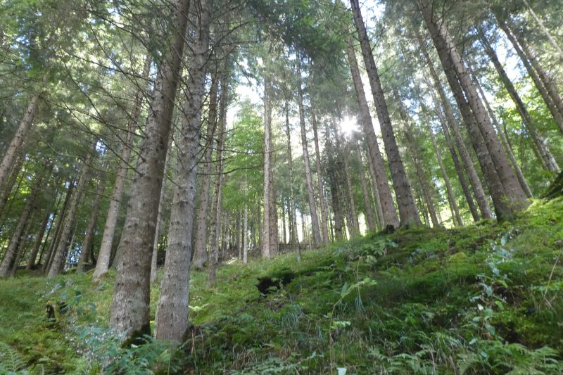 Il tempo è cambiato rapidamente, il cielo terso e azzurro è diventato nuvoloso e minaccia pioggia: alla fine è meglio per me fare questa comoda passeggiata invece di essermi inerpicata sulle creste del Palughet. Ora piove leggermente, ma sotto agli alberi le gocce quasi non mi toccano, non metto nemmeno la giacca impermeabile.