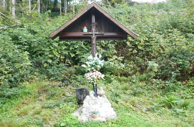 Arrivo alla Croce con il Cristo de le Traversade, m. 1293, non proseguo oltre perché da qui in poi il posto è interessato dai lavori di ripristino, la stradina ha mezzo metro di fango, ruspe e cingolati sono posteggiati a lato insieme a cataste di tronchi e arbusti. La pioviggine però è cessata, le nuvole si diradano e la vista verso l’Agnèr è meravigliosa, riesco a vedere ai suoi piedi il Rifugio Scarpa-Gurekian che ho raggiunto molte volte negli anni scorsi. Ritorno indietro, ma invece di ripercorre la stradina prendo il sentiero segnalato “n. 2 sali e scendi” in mezzo al bosco arrivando ad un ruscello di acqua rossastra, che scorre gorgogliando tra abeti e muschi.