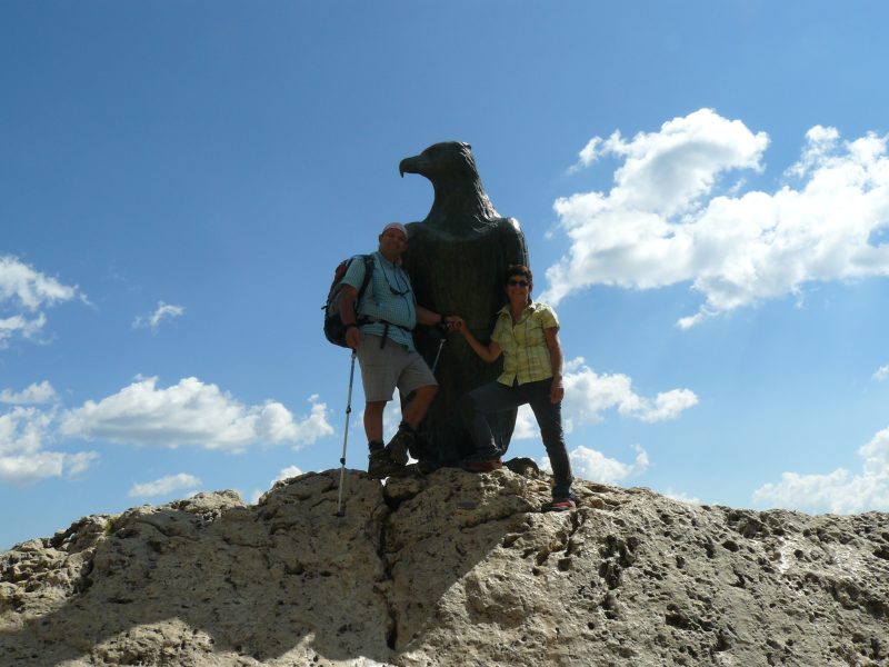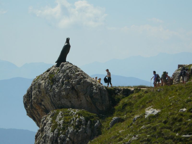 Le nostre due amiche si fermano invece a prendere il sole sui prati vicino al rifugio, rientrati dalla Cima ci rilassiamo sui prati anche noi, per il rientro facciamo il sentiero che ci porta al Monumento Theodor Christomannos, ideatore della Strada delle Dolomiti, aspettiamo il turno per la fotografia accanto all’Aquila di bronzo che si trova sul sentiero delle Masaré numero 549 S.A.T C.A.I.  L’Aquila è alta 2,50 metri ed è stata eretta nel 1912, un anno dopo la morte di Christomannos.