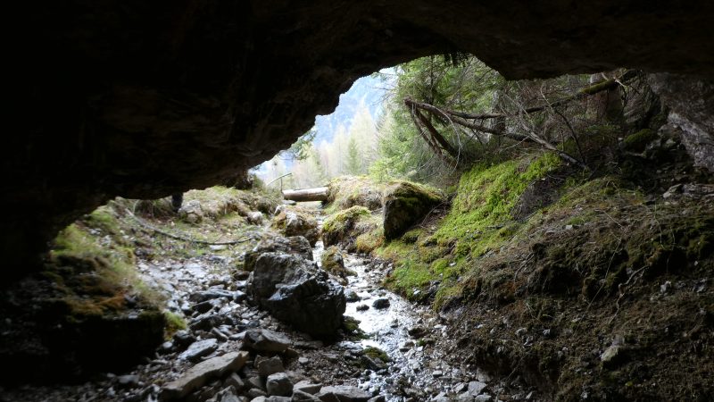 Le vette dei monti sono ricoperte di neve: Zimòn, Sfornioi, Rite … lo spettacolo è incantevole, ma noi cammineremo ad una quota inferiore. Scendiamo a Cibiana Bassa, m. 942, passando tra le vecchie, bellissime case di pietra abbellite da vasi di fiori e da alcuni dei famosi murales, gli affreschi che rappresentano antichi mestieri e scene di vita passata. Raggiungiamo il fondo valle, oltrepassiamo il ponte sul torrente Rite e cominciamo a camminare in mezzo ai bei boschi, per il largo sentiero indicato dal cartello “Vallesina” e dal cartello “Miniere di Carsiè- Ronzei”. Il sentiero sale nel bosco, siamo circondati da un’atmosfera magica, su un masso troviamo l’iscrizione “Bosco dei Sogni” e poter ammirare dalle radure l’imponente Antelao ammantato di bianco è davvero un sogno. Arriviamo al sito delle antiche miniere dove si estraeva il ferro, un sentiero si stacca sulla destra e risale verso i tre ingressi principali, arroccati tra le rocce, della miniera di Carsiè. Arriviamo fino all’ingresso delle tre buie caverne, rinunciamo a proseguire per la miniera di Ronzei perché il nostro giro odierno sarà già abbastanza lungo. Continuiamo per il sentiero che a tratti ci gratifica con la vista dell’Antelao e della Valle del Boite con i suoi paesini sovrastati dalle magnifiche cime dolomitiche. Incrociamo una lunga sterrata che seguiamo verso destra in leggera salita fino alla bella radura dove sorge la Ciasa (Casa) del Conte, m. 1502, adibita a bivacco: una casera accogliente, sarebbe adatta ad una passeggiata con relativa grigliata … e sonnellino al piano superiore.