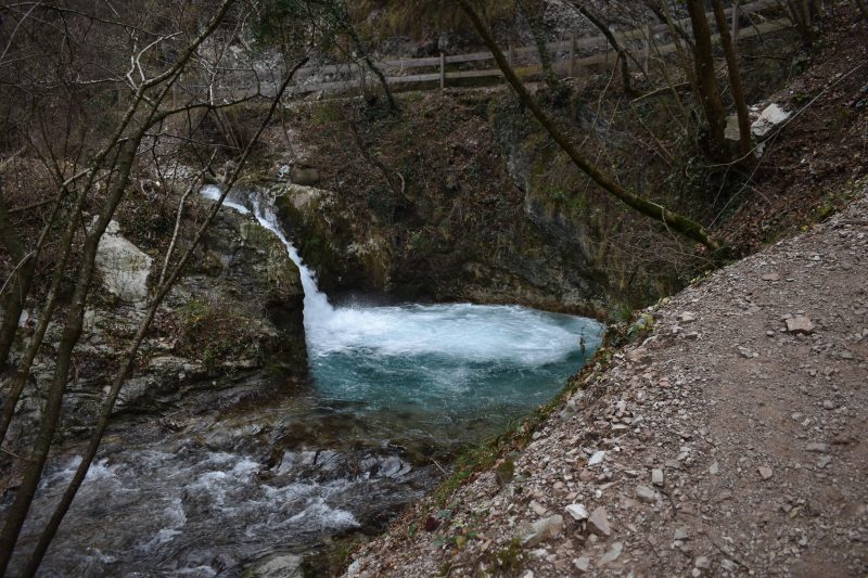 L’acqua scende limpida e scorre nel letto del torrente formando cascatelle e pozze che assumono un colore verde smeraldo. Scatto alcune foto e proseguo, salendo delle scale di legno guadagno quota e giungo nella parte superiore della forra dove ammiro ancora il lavoro dell’acqua che scava la roccia, forma piccole e rumorose cascatelle, sbatte contro i sassi e va via.