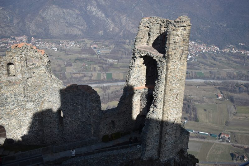 La mattina alle 9 partiamo con i camper e con alcune auto, raggiungiamo la Sacra di San Michele che dista circa 30 km e troviamo un comodo parcheggio. Per raggiungere la Sacra passiamo per i resti del sepolcro dei Monaci, saliamo il viale che passa sotto la chiesa e arriviamo alla biglietteria. Da qui dopo aver convalidato il biglietto e la prenotazione tramite il sito attendiamo la guida. Molti di noi infatti hanno prenotato la visita guidata al costo di 10 euro, avremo a disposizione una guida teatrale e simpatica che ci intratterrà per quasi un’ora elargendoci aneddoti e spiegazioni su nascita, vita, declino e rinascita della Sacra. Seguendo la guida saliamo i primi gradini d’ingresso della chiesa, dopo una prima descrizione con alcune regole per la sicurezza proseguiamo e saliamo lo scalone dei Morti, dove seguiamo la lezione di storia. Arrivati nella chiesa ci sediamo tra i banchi per ascoltare la guida che ci racconta altri aneddoti, storie e leggende. Poi ognuno può aggirarsi tra le mura per conto proprio e visitare la torre della Bell’Alda, storia triste, quella della povera Alda… siete curiosi? La torre fu costruita nel XII secolo, ubicata all’interno del complesso dell’Abbazia denominato “Nuovo Monastero” poi distrutto in gran parte a causa di alcuni terremoti.