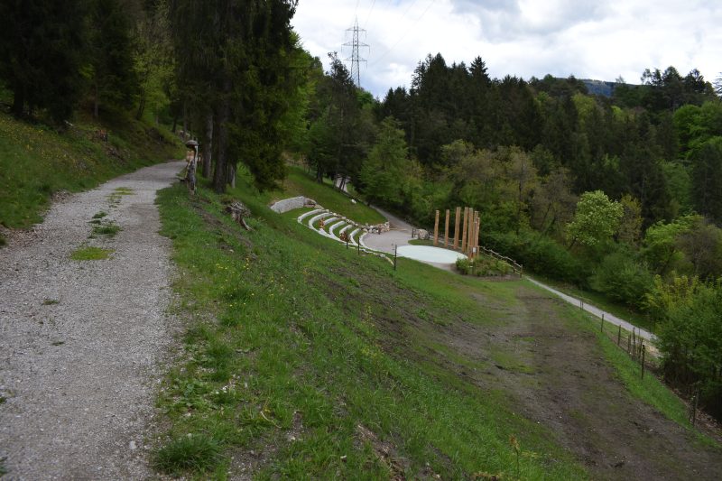 Cammino ancora per un po’ e raggiungo un’altra costruzione del Parco, chiusa, dovrebbe essere un museo delle piante, da qui si diramano alcuni sentieri anche della S.A.T / C.A.I., prendo quello che sale e arrivo alla Località i Baschéri, sulla destra trovo un capitello dedicato a San Vigilio, un parcheggio per auto e il punto di partenza per la visita al Bosco Arte Stenico Trentino.